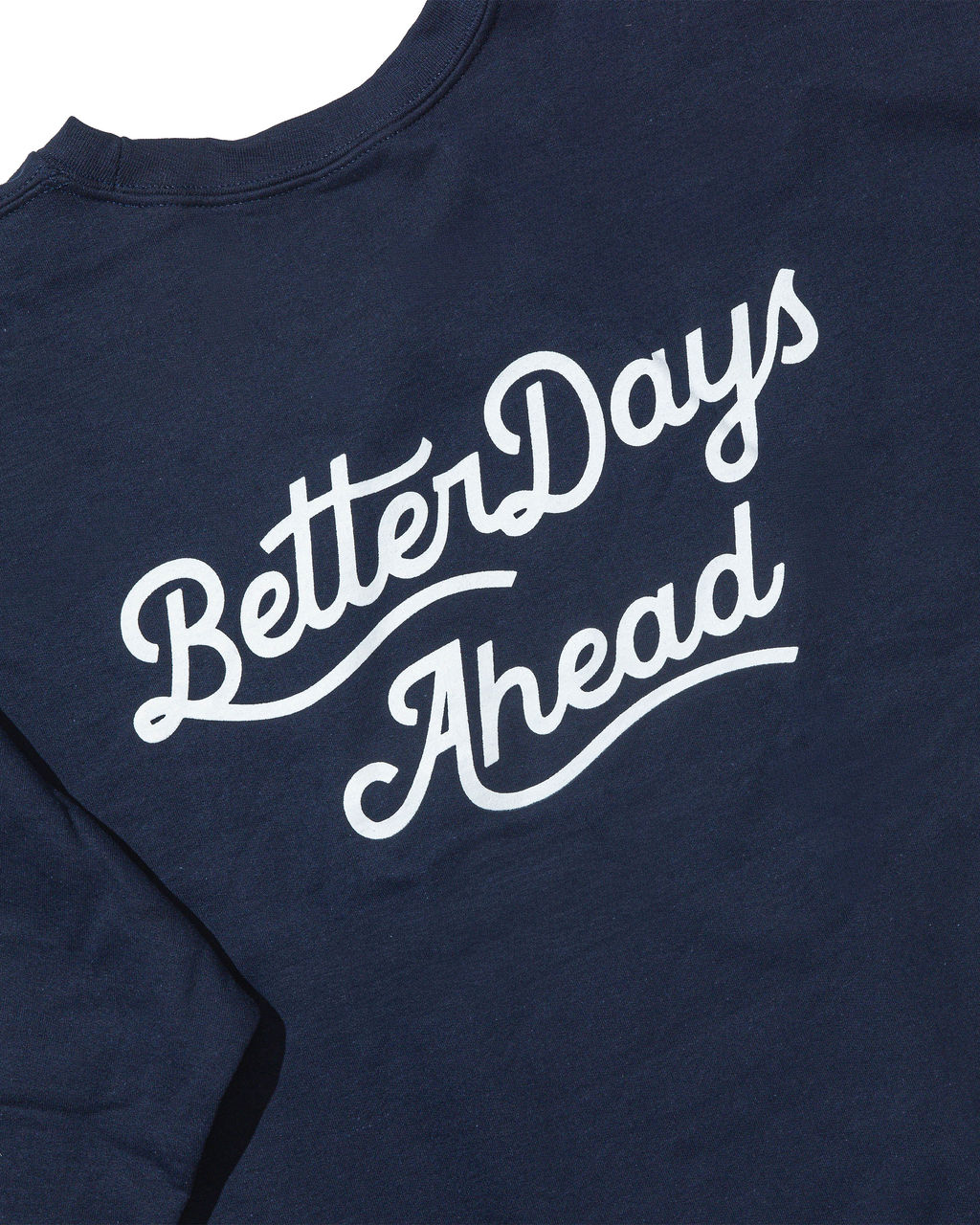 Our premium navy crew features a custom cursive BetterDays Ahead logo on the front and a statement back design for a clean, modern look. Available now in two fits: Better (L) for a relaxed feel and EvenBetter (XXL) for an oversized vibe. Easy, comfortable, and made for daily wear.